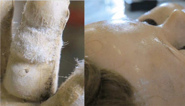 The loss of additives often causes noticeable changes to the objects such as distortion, embrittlement or loss of mass. Additionally, surface deposits are a common result of additive migration. These deposits—known as “bloom”—appear as oily, tacky or crystalline features on the surface, as shown in the photograph below. It comes from the polymer mixture undergoing a phase separation and the additives migrating to the surface.